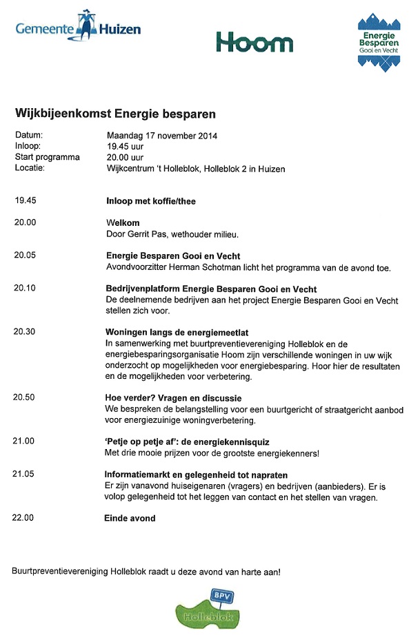De gemeente Huizen organiseert op maandagavond 17 november weer een wijkavond over energie besparen. De bijeenkomst, die speciaal is bedoeld voor inwoners uit een deel van de wijk Huizermaat, wordt gehouden in wijkcentrum Holleblok.