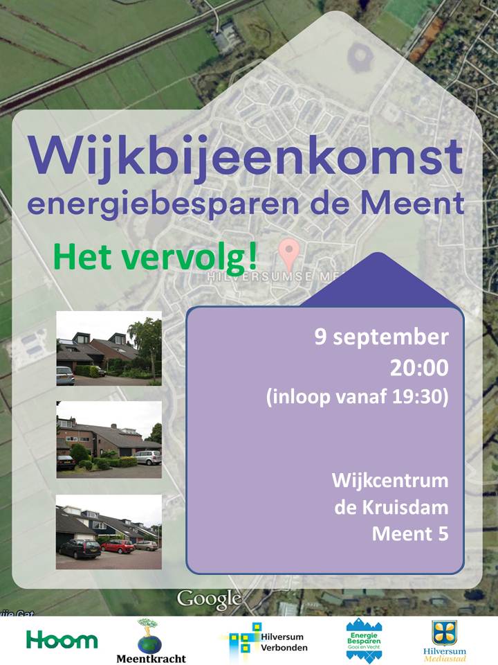 Graag nodigt het bewonersinitiatief Meentkracht (Hilversumse Meent) in samenwerking met Hoom, de Gemeente Hilversum en de Stichting Hilversum Verbonden alle Meentbewoners uit voor de vervolgwijkbijeenkomst over (collectieve) energiebesparing, dinsdag 9 september, 20.00 (inloop vanaf 19.30).