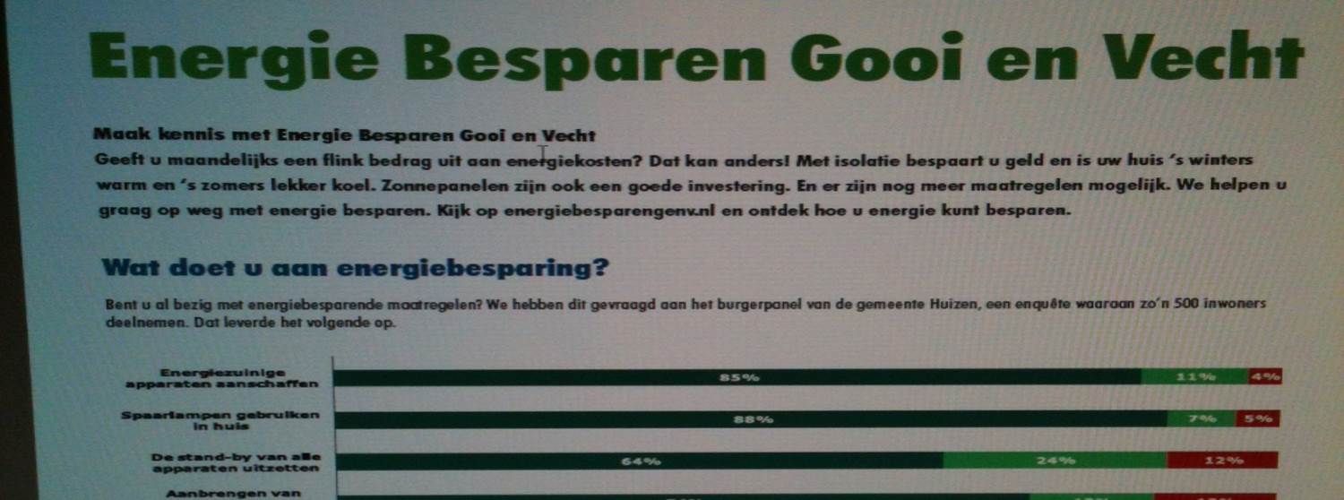 Circa 500 burgers gaven in het burgerpanel antwoord op deze vragen. De antwoorden staan in de milieukrant die deze week weer bij alle Huizer-huishoudens op de mat valt. En natuurlijk is ook in deze editie weer volop aandacht voor Energie Besparen Gooi en Vecht.